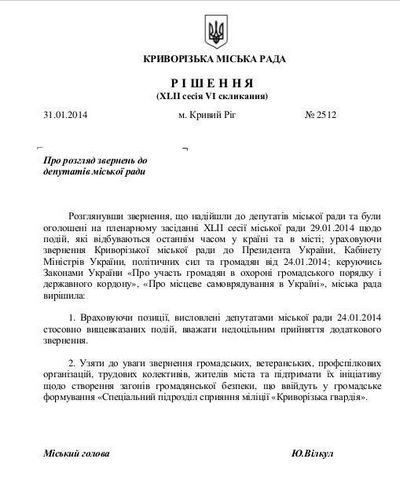 Еще одно голосование, о котором стремятся забыть нынешние кандидаты, состоялось 31 января года. Решение №2512 со скромным названием О рассмотрении обращений к депутатам городского совета вызвало бурную реакцию интернет-СМИ и ФБ-сообщества: «В Кривом Роге «спортивных парней» легализовали в «гвардию»- информирует радио Свобода , «Вилкул призвал «титушек» вступать в «Криворожскую гвардию»- пишет интернет-издание Днепроград . Обобщающий смысл публикаций - Криворожский городской совет легализовал титушек . В тексте документа это звучит так, что горсовет поддерживает инициативу по созданию отрядов гражданской безопасности, которые войдут в общественное формирование «Специальное подразделение содействия милиции Криворожская гвардия .